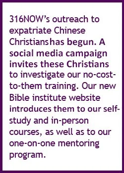 316NOW, working with other Confessional Lutheran organizations, is developing a strategy to invite expatriate Chinese church leaders to attend our Bible institute and to benefit from our mentoring and consulting ministry. The goal is to prepare them to raise up Biblically sound house churches when they return to China.